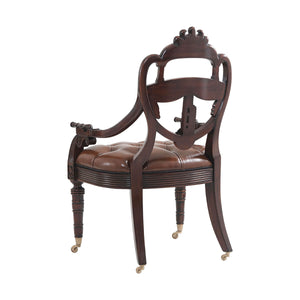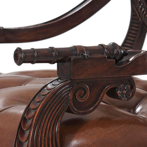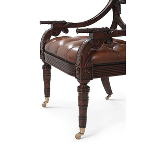 English Armchair - Carved Coat of Arms - an exceptionally well hand-carved mahogany library armchair, the back in the shape of a ship's transom carved with a Coat of Arms centered by the Spencer crest and flanked by Victory wreaths. Inspired by a Regency original.
