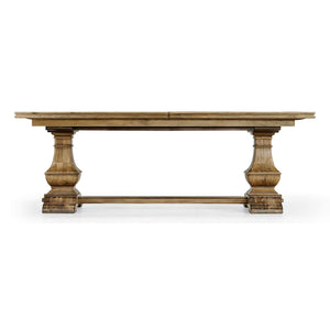 An English country extending dining table with a parquetry inlaid top on bold pedestal supports with a stretcher.