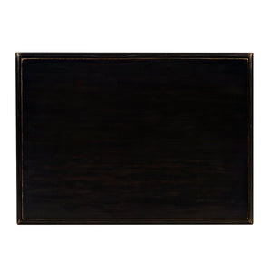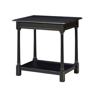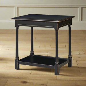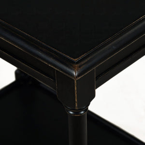 The lower-tier shelf with a stretcher base offers both practicality and charm, making it an ideal addition to your living space. With its rich black lightly distressed finish and timeless silhouette, this table seamlessly blends sophistication and functionality, bringing a touch of historical elegance to any room.