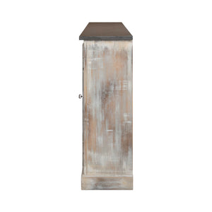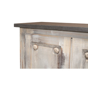 With a stonwe gray painted top, the beautifully weathered gray finish creates a soft, time-worn look, while the classic panel doors and vintage-style hardware evoke images of a rustic countryside retreat.