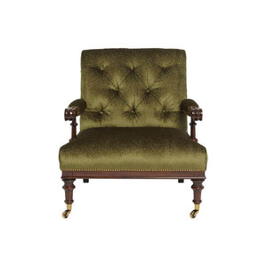 An upholstered mahogany 'easy' chair, the scroll over tufted back with scroll terminal padded arm on turned uprights, the tufted seat on a serpentine seat-rail on turned and tapering legs with brass cappings and castors.