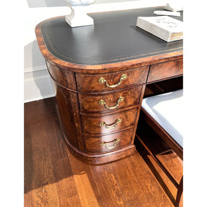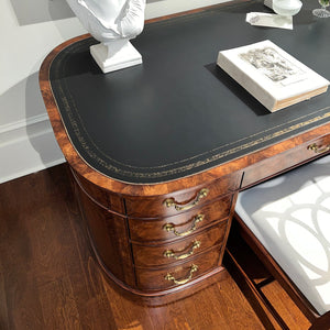 The pedestal desk features nine spacious drawers, adorned with elegant brass handles, offering convenient storage for your writing essentials and office supplies. The classic design is complemented by rounded ends adding a touch of traditional charm to any room. Perfect for a study, home office, or living room, the English Leather Top Writing Table combines beauty and functionality, making it an exquisite addition to your home decor.