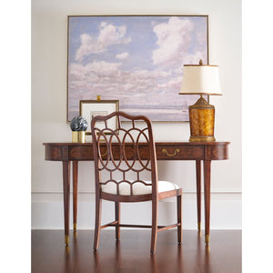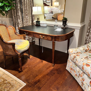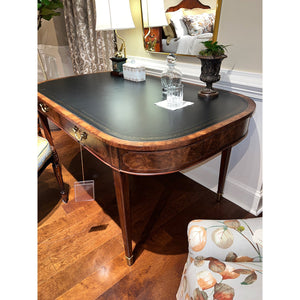 The table features two spacious drawers, adorned with elegant brass handles, offering convenient storage for your writing essentials and office supplies. The classic design is complemented by slender, square tapered legs with brass-capped feet, adding a touch of traditional charm to any room. Perfect for a study, home office, or living room, the English Leather Top Writing Table combines beauty and functionality, making it an exquisite addition to your home decor.