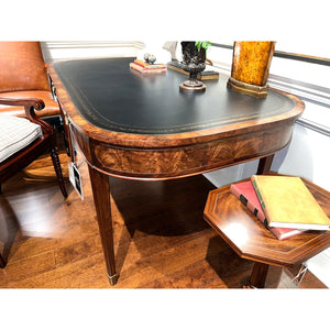 Elevate your workspace with the refined elegance of the English Leather Top Writing Table. Crafted from high-quality wood, this table boasts a luxurious figured walnut finish that exudes timeless sophistication. The top is adorned with a rich black leather surface, providing a smooth and stylish area for writing, reading, or working on your laptop.