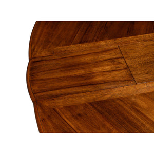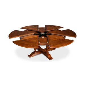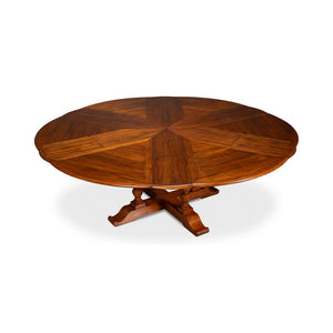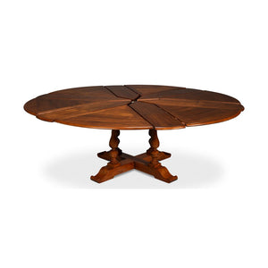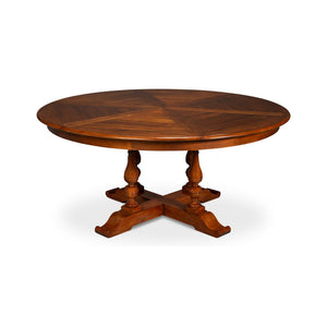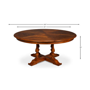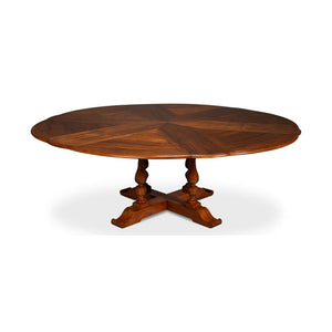 The English Round Jupe Dining Table - 100" is a perfect blend of timeless elegance and modern functionality. Featuring an Old World walnut finish, and a farmhouse-patterned walnut top, supported by four beautifully turned baluster wood uprights connected to a classic X-frame style base.