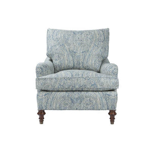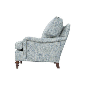 An upholstered armchair, the rectangular 'T' cushion back and seat enclosed by English arms, above a padded rail, raised on turned and tapering legs with brass cappings. Inspired by a 19th century English original. Fruitwood finish standard, and available in other finishes.