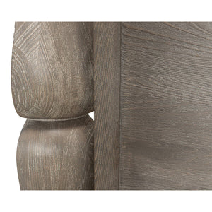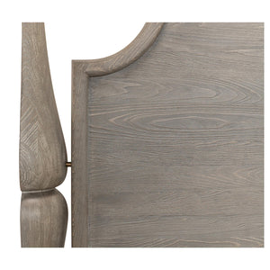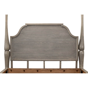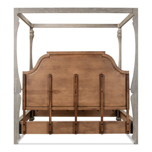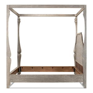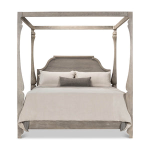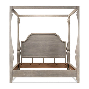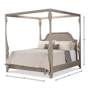 A European-style canopy bed with a grey moonstone finish. This bed features beautifully carved posts crafted from beechwood and accented with iron and brass.