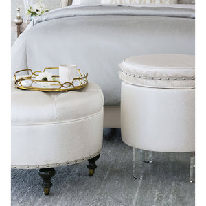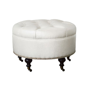 Elevate your space with the Faux Ostrich Leather Ottoman, a luxurious blend of classic elegance and modern sophistication. Bench-made in the USA, this ottoman features deep button tufting and a plush, dotted faux ostrich leather upholstery in metallic ivory. The small self-welt trim and layered brushed nickel nailheads add a refined, tailored touch.