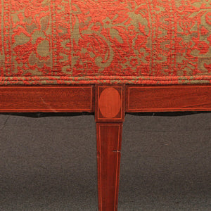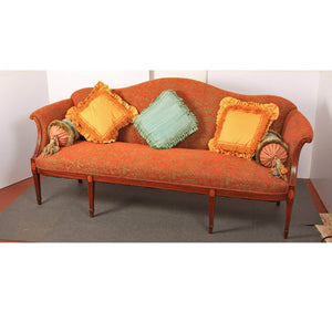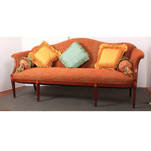 A Fine Federal mahogany inlaid sofa with an arched camel back, with scroll arms on six legs, the beautifully upholstered cushion backrest, seat, and arms are in wonderful, clean, ready-to-use condition. The arms with bellflower inlays and legs with oval and line satinwood inlays. American, ca 1790