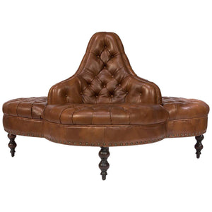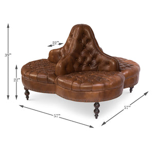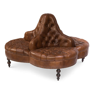 A Classic style four-sided lobby sofa ideal for a large lobby or foyer. With vintage style brown tufted leather upholstered backrests and seats, raised on turned mahogany feet and finished with brass nailhead trim.