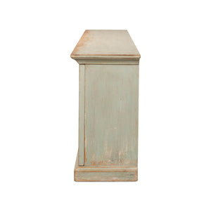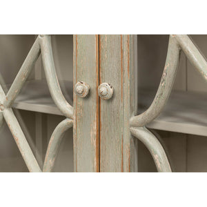 With a flat rectangular top above four doors with openwork details in front of glass opening to a painted interior with shelves. A multi-layer antique sage painted finish and iron hardware give it the weight of an heirloom in an airy design right for today.