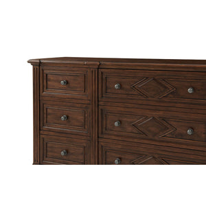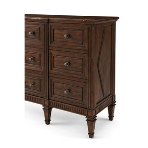 French Antique Style Dresser, in a dark walnut finish with a molded edge rectangular top, nine paneled drawers with lozenge detailing motifs, antiqued pewter handles, with a fluted base and raised on square tapered legs. In the French Directoire style.