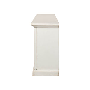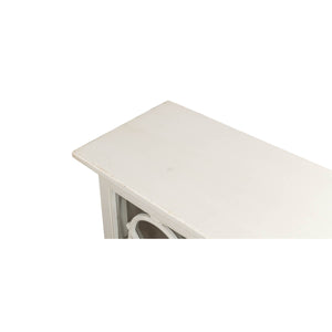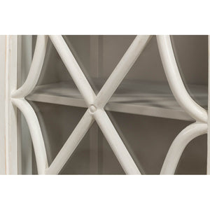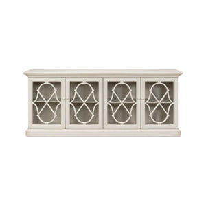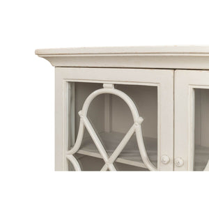 With a flat rectangular top above four doors with openwork details in front of glass opening to a painted interior with shelves. A multi-layer antique white finish and iron hardware give it the weight of an heirloom in an airy design right for today.