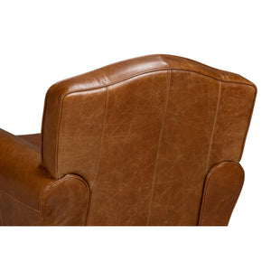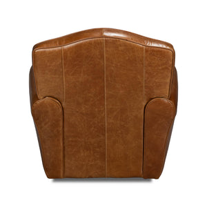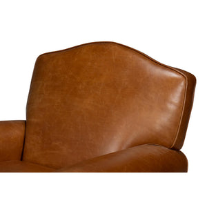 French Art Deco Style Brown Leather Club Chair, An Art Deco style leather upholstered club chair, in our Vintage Cuba brown leather, with long rolled arms, a padded seat back, and cushions, with detailed nailhead trim and raised on a swivel base.