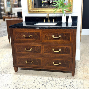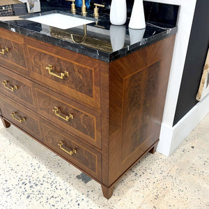 Elevate your bathroom with the refined elegance of our French Bathroom Vanity Dark Walnut. Inspired by 18th-century Louis XVI design, this piece showcases meticulous craftsmanship with its crossbanded and inlaid detailing. The rich combination of crotch and straight walnut radiates warmth and sophistication.