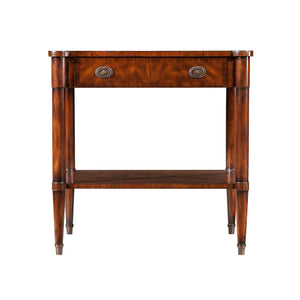 A Neo-Classic style French bedside table, the rectangular top with rounded protruding corners and one frieze drawer, on turned legs joined by an under tier.