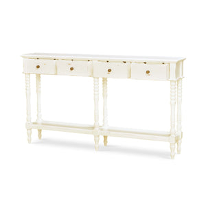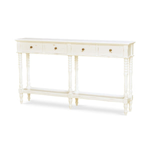Bring a touch of French country charm to your home with this elegant French Country Console Table in a stunning White Harvest finish. Designed to add sophistication and functionality, this table features beautifully turned legs and four frieze drawers, providing ample storage for your essentials. The lightly distressed white finish gives it a warm, vintage appeal, perfect for enhancing any room's decor.