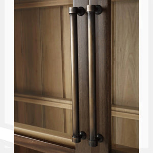 Two tall glass doors help frame the cabinet’s plank-style back, blending farmhouse character with artisan elegance. Slim vertical handles and clean-lined legs modernize the profile, making it equally suited to French country, coastal, or transitional spaces. A true statement piece, this cabinet offers both warmth and architectural distinction.