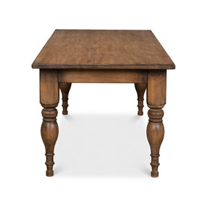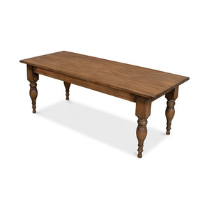 The table spans an inviting 83" in width, 35" in depth, and stands 30" high, offering ample space for family feasts and lively gatherings. Bold-turned legs provide a sturdy foundation and add to the traditional aesthetic. The solid plank top showcases the natural grain of the wood, finished in a warm, welcoming brown that promises to complement any décor.