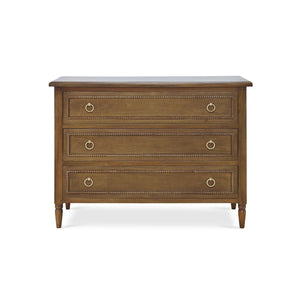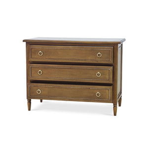 With three spacious drawers, it provides ample storage for your essentials, while its elegant design enhances any room's décor. The beautifully detailed drawer fronts are accented with delicate ring pulls, adding a classic touch to its overall aesthetic. Raised on turned and tapered legs.