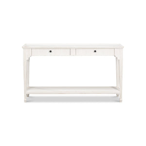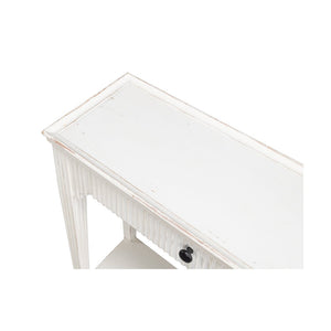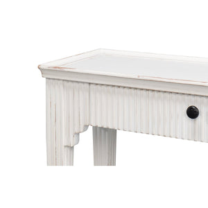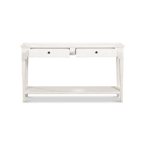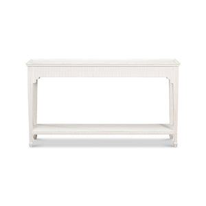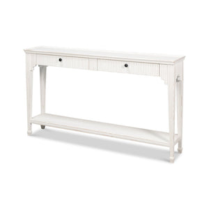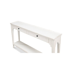 Elevate your space with the timeless charm of the French Country Painted Console. Featuring a gracefully distressed White Bungalow finish, this elegant console embodies vintage European sophistication. The fluted drawer fronts and tapered legs, rectangular dish top, and subtle carved details reflect the refined aesthetics of classic Gustavian and French Provincial designs.