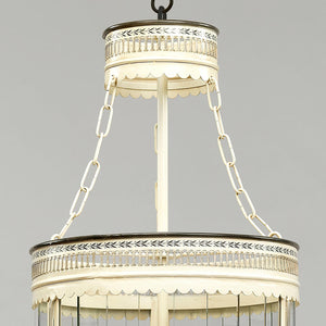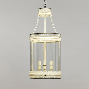 French Ivory lantern, based on a French design, the delicate hand-painted decoration on the slatted glass adds texture. The motif on the coronet is reflected in the decoration on the central body. The three-light lantern has a hand-painted steel frame with glass and a patinated ivory finish.
