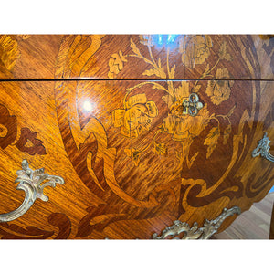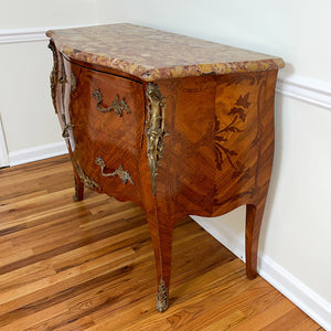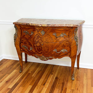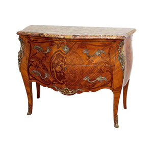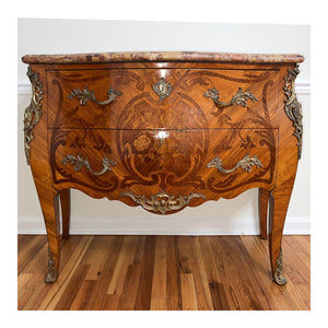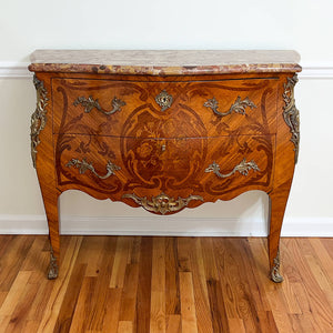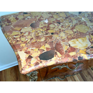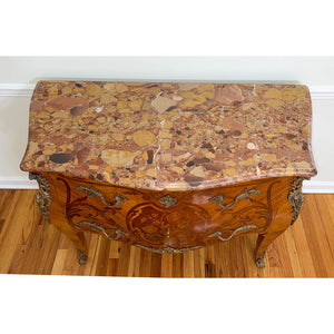 A fine French Louis XV marble top commode with serpentine and bombay form, this commode has Breche D'Alep marble with a molded edge, fine detailed floral marquetry patterns, rococo gilt bronze mounts, and sans traverse drawers. France, Late 19th century.