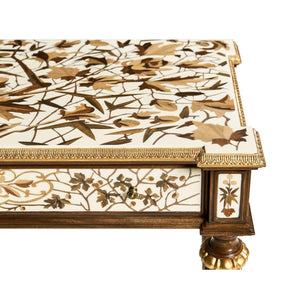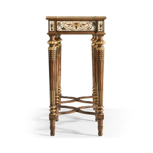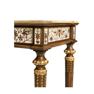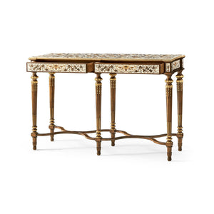 Elevate your home with the exquisite French Louis XVI Console Table, inspired by the grandeur of 18th-century French design. This masterpiece is adorned with a sumptuous maple leaf and acorn marquetry pattern, showcasing the splendor of nature with every intricately placed piece. The craftsmanship reaches new heights with the Scagliola technique, infusing the marquetry with a white lacquer that captures the light and draws the eye, creating a stunning visual symphony.