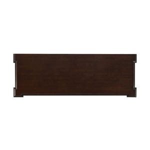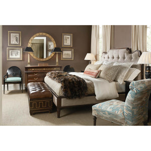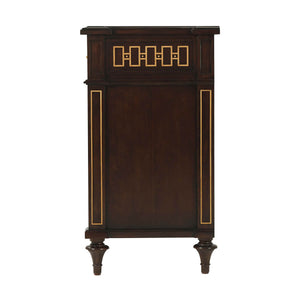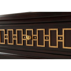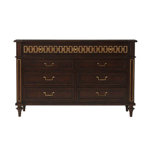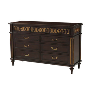 French Neo Classic Dresser in a mahogany finish with gilded highlights. With a shaped chamfered edge top with a relief decorated three drawer freize, above six generously sized paneled drawers. With brass bail handles raised on turned toupee feet.