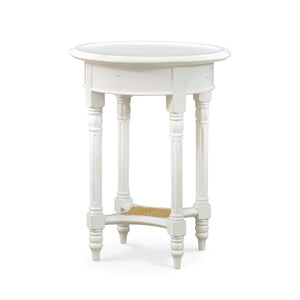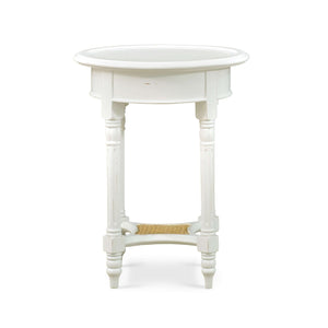 The molded round top is raised on turned and fluted legs with an natural rattan finish lower shelf. Crafted with solid wood, this end table ensures durability and longevity, making it a cherished addition to your home.