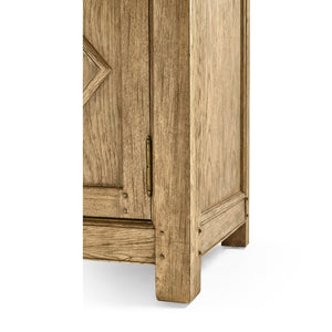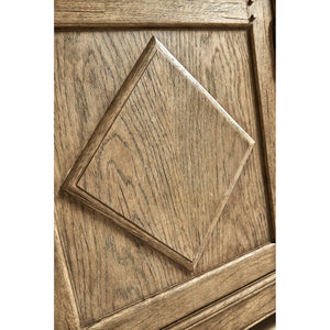 The doors feature decorative panels with a classic diamond motif, complemented by custom cast hardware that adds a touch of elegance.