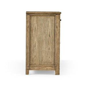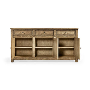 Finished with wire brush techniques that enhance the natural chestnut grain, giving it a unique texture and rich visual depth. Equipped with three pull-out drawers and three doors, each revealing interior shelving, perfect for organizing everything from dinnerware to media devices.