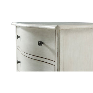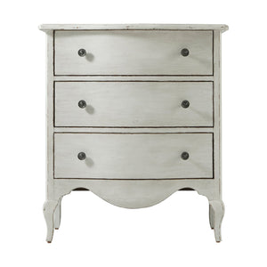 French Provincial White Painted Nightstand, with a distressed painted finish, serpentine front and top, with a molded edge, three drawers raised on short cabriole legs. In our off-white rustic nora painted finish.