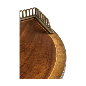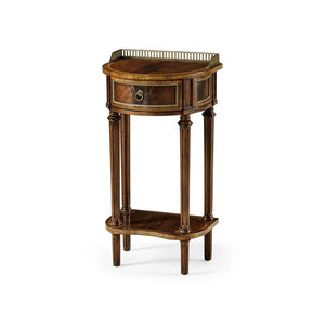 George III Style Mahogany demilune console table with a fine cast pierced antiqued brass gallery, single drawer with brass beading and a crossbanded shaped under-tier. Raised on turned, tapered, and fluted legs.