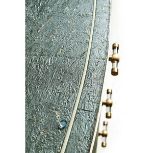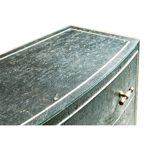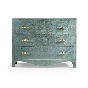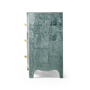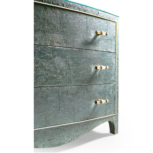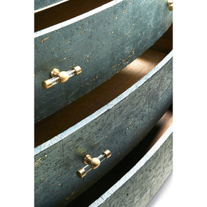 Dive into the opulent design of the Georgian Bow Front Bedside Chest, where exquisite craftsmanship meets a modern, mesmerizing aesthetic. This unique piece showcases a dynamic teal cork wallpaper finish speckled with golden flecks, creating a textural delight that mimics the serene beauty of sea foam. A sleek, recessed glass top provides a stable and stylish surface for lamps, books, or decorative items.