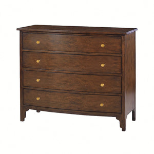 Georgian bow front dresser with four self-closing drawers and turned and hand polished brass hardware, with a “country” wood tone finish with natural highlights, time-worn physical distressing, and hand-rubbed satin sheen raised on bracket feet.