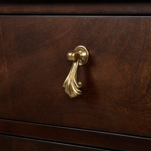 Georgian style bowfront chest with four self-closing drawers and hand-cast polished brass flourish hardware with a mahogany figured front with solid and mahogany veneers.