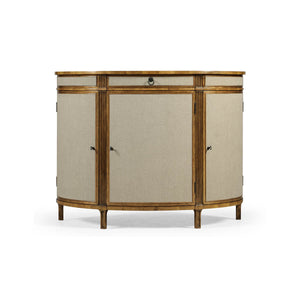 Georgian Modern Demi Lune Cabinet – a sophisticated fusion of classic and contemporary design. Expertly crafted, this cabinet boasts a solid case with Kravet linen fabric cabinet doors and understated hardware. The grey fruitwood top, which sits atop the cabinet, is an elegant touch. The cabinet also features raised tapered feet with traditional accents for a timeless touch.