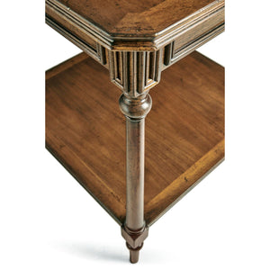 The paneled frieze enhances the table's intricate design, while the turned baluster legs provide a robust yet elegant support structure. An under-tier offers additional storage or display space, making this side table both beautiful and functional.