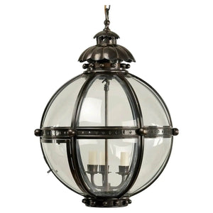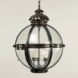 The Globe Lantern is based on a similar 19th-century antique. The globe shape of the fixture emanates strength and is united by the solid bronzed brass finials and acanthus top.
