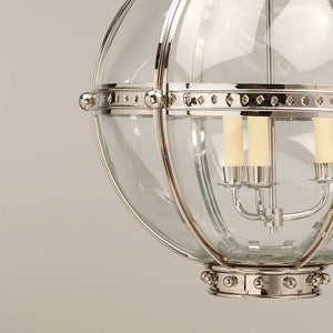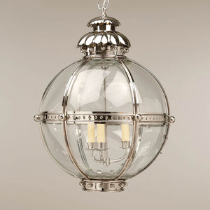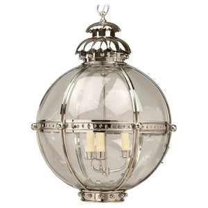 The Globe Lantern is based on a similar 19th-century antique. The globe shape of the fixture emanates strength and is united by the nickel finish finials and acanthus top.