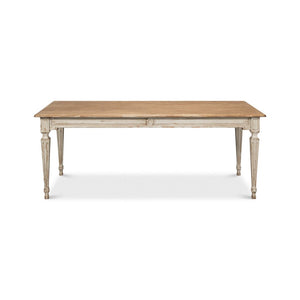 A tribute to the timeless elegance of 18th-century Louis XVI style, the Gray French Provincial Dining Room Table exudes a refined charm with its classic lines and well-loved distressed finish. The natural wood top showcases a weathered patina, seamlessly blending rustic warmth with sophisticated craftsmanship. A light gray-painted base, featuring a distressed painted finish, enhances its antique-inspired allure. The molded apron and square tapered fluted legs complete the piece, adding an air of Parisian grace to any dining space.