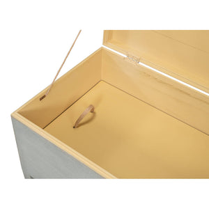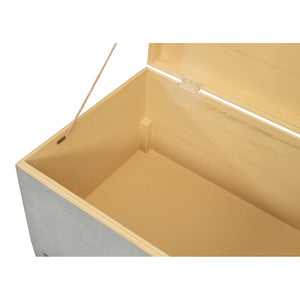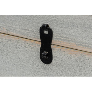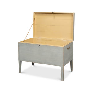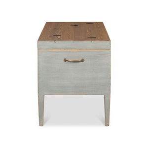 Gray Painted Rustic Pine Trunk Table, is a rustic-style cityscape gray painted wooden trunk that exudes vintage charm and functionality. Constructed of a richly textured hardwood, evidenced by the pronounced grain, which suggests durability and natural beauty.
