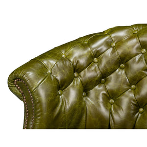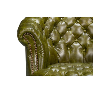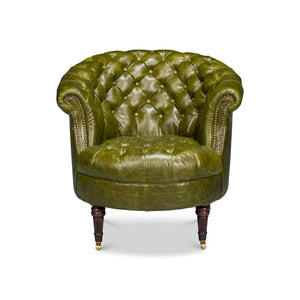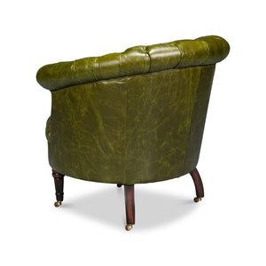 The Green Leather Barrel Back Chair exemplifies classic English design and luxurious craftsmanship. Upholstered in rich, top-grain British Green leather, its elegantly curved barrel back is adorned with deep button tufting, exuding timeless sophistication.