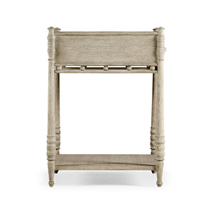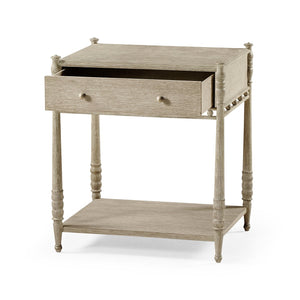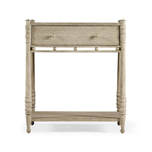 Elevate your bedroom with the timeless elegance of the Greyed Oak Rustic Bedside Table. Crafted from premium oak and finished in a sophisticated washed grey oak, this piece seamlessly blends rustic charm with transitional style. Intricate wood carving details, turned legs with urn accents, and an open fretwork design below the drawer add a touch of artisanal craftsmanship.