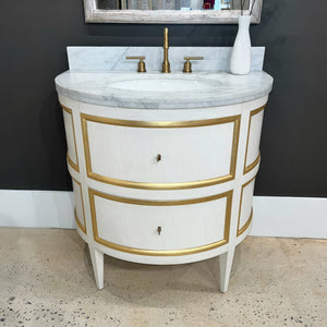 A statement of timeless elegance, the Gustavian White Painted Marble Top Vanity seamlessly blends classical artistry with modern functionality. Its White Carrara marble top exudes refined luxury, while the antique white painted finish is accented with hand-applied gold leaf detailing, evoking Old-World charm.