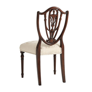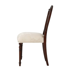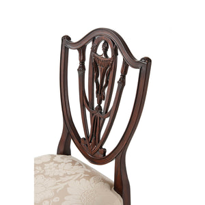 Hepplewhite Shield Back Dining Chair, a Georgian style side chair in the manner of George Hepplewhite. With a carved shield back and vase carved splat above an upholstered seat, on carved acanthus turned and fluted tapering legs.