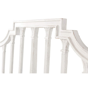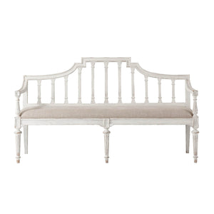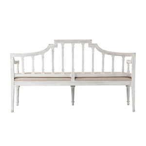 A George III (Hepplewhite) style carved and painted Settee with molded angular arched back rail with carved and fluted slats, down swept arms with fluted baluster supports on an upholstered seat cushion and raised on turned, tapered and fluted legs.