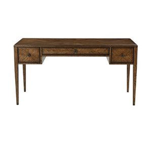 An Italian Neo-Classic style oak parquetry desk with a starburst patterned oak parquetry top to bottom. It has a central drawer flanked by two further additions. It rests on tapered legs. It has an oak finish complimented with Verde Bronze finished handles.