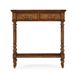 Crafted with timeless elegance, the Jacobean Short Narrow Console Table is a refined addition to any sophisticated interior. Designed in an antique walnut finish, this console features a planked top and shelf, lending a rustic charm to its classic silhouette. The two drawers, adorned with custom cast brass hardware, provide discreet storage while maintaining the table’s refined aesthetic.